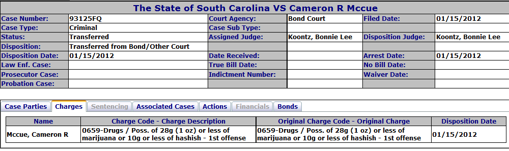 PWID Ecstasy - Dismissed by the 9th Circuit Solicitor. Why? Because four days earlier McCue had been sentenced to three years probation in Dorchester County and the 9th Circuit Solicitor saw that as a way to get out of doing her job. This was done in spite of the fact that McCue repeatedly failed to appear in court on these charges and multiple bench warrants had to be issued.