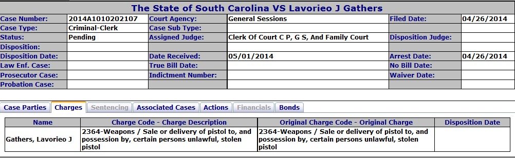 First up is Lavorieo Gathers. On 26 April he was charged with two counts of Unlawful Carrying of a Pistol and two counts of Unlawful Possession of a Pistol. His total bond was set at $30,000. Gathers bonded out of jail on May 3rd.