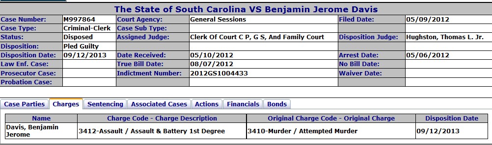 The first person arrested, Benjamin Jerome Davis, was charged with two counts of attempted murder and one count of possession of a firearm during a violent crime. The 9th Circuit Solicitor dismissed one count of attempted murder and the weapon possession charge, because, you know, those gun charges donât mean a damn thing anyway, right? Then they reduced the attempted murder charge for shooting Marquiese Lawrence to 1st Degree Assault & Battery. Judge Thomas “Felonâs Friend” Hughston actually sentenced Davis to 10 years, suspended to 5 years followed by 2 years probation. Davis is due to be released from Kershaw Correctional in February of 2015.