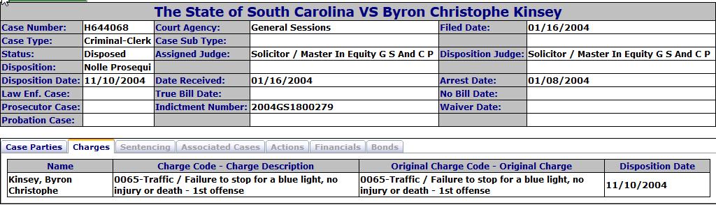 We didnât find much on Robert Crumm other than some traffic citations and a recent conviction for giving false information to a law enforcement officer in Summerville. Kinsey is a different story.