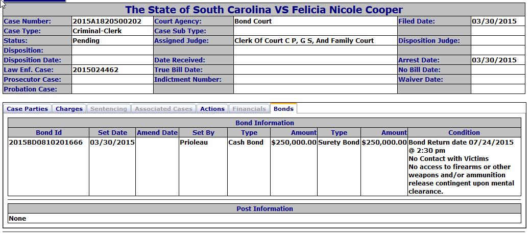 This is not the first time Cooper has been in jail. In December 2014 she was charged in Charleston County with 3rd Degree Assault & Battery. She was found guilty in early March and sentenced to a fine or jail time. She was making time payments.