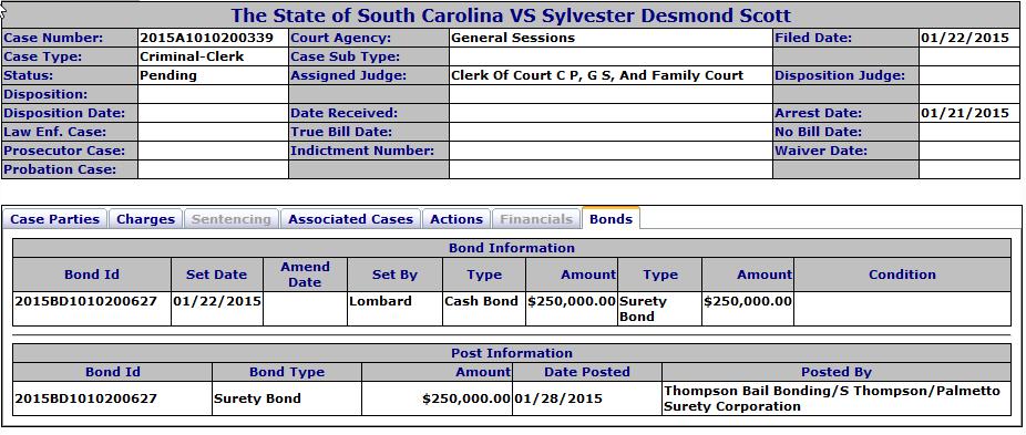 We find it amazing that any bonding company would take on a defendant like Scott, a recently released convict with no collateral, not even a pot to piss in to his name, and risk $275,000 on him. Maybe he had some heroin cash stashed and they didn’t have to finance his bond.