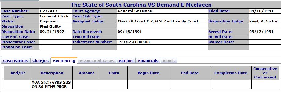 Distribution of Crack - Reduced to Possession of Crack by the 9th Circuit Solicitor. Sentenced by Judge Victor Rawl to a YOA term of 6 years, suspended in favor of 30 months probation.
